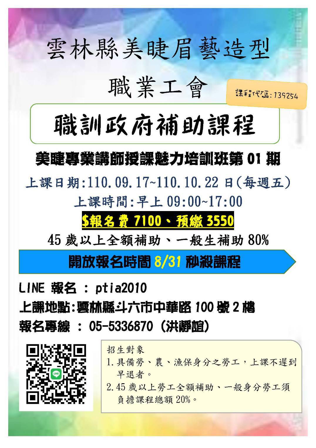 政府出錢給你上課 110下職訓補助課程已經開始報名囉~ 有勞保即可上, 政府每人每三年補助七萬 讓您學習無負擔 一般身份只要自付訓練費20% 特定對象、年滿45歲 則完全免費(!)(!)(!) 即日起陸續開放報名 名額有限!搶報要快! 詳情請洽05-5362539 洪小姐 美睫專業講師授課魅力培訓班第01期(139254) 110/09/17 ~ 110/10/22(週五班)09/1線上開放報名 https://ojt.wda.gov.tw/ClassSearch/Detail?OCID=139254&plantype=1 訓練單位:雲林縣美睫眉藝造型職業工會
